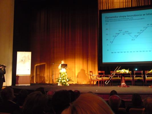 11 października 2010r. na zaproszenie Ministra Pracy i Polityki Społecznej p. Jolanty Fedak uczestniczyliśmy w uroczystych obchodach 90- lecia publicznych służb zatrudnienia w Polsce. Miejscem Konferencji był Teatr Polski w Warszawie a prowadzona była przez p. Czesławę Ostrowską - Podsekretarz Stanu w MPiPS. W uroczystości udział wzięli między innymi starostowie powiatów, dyrektorzy wojewódzkich i powiatowych urzędów pracy, osoby związane ze strukturami publicznych służb zatrudnienia obecnie i w przeszłości, pracownicy naukowi zajmujący się problematyką rynku pracy i polityką społeczną oraz przedstawiciele organizacji pozarządowych i związków zawodowych. Pani minister Jolanta Fedak powitała wszystkich uczestników uroczystości i wystąpiła z okolicznościowym przemówieniem, w którym zwróciła uwagę na rolę PSZ, która zmienia się tak, jak zmienia się koniunktura w gospodarce. Zwróciła uwagę, że to właśnie okresy gospodarczej depresji sprawdzają najlepiej skuteczność działań urzędów pracy. Następnie zmiany w polityce zatrudnienia w ostatnim 20- leciu nakreśliła p. Prof. Małgorzata Szylko- Skoczny - Członek Naczelnej Rady Zatrudnienia. Zebranym został zaprezentowany również film ukazujący historię i teraźniejszość Publicznych Służb Zatrudnienia na przestrzeni ostatnich 90 lat. "Publiczne służby zatrudnienia- ewolucja i oczekiwania", to panel dyskusyjny, który prowadziła p. Prof. Elżbieta Kryńska. W dyskusji głos zabrali byli ministrowie pracy i prezesi Krajowego Urzędu Pracy: m.in. p. Czesława Ostrowska, p. Michał Boni oraz p. Tadeusz Piłat. W takcie konferencji została także omówiona rola Publicznych Służb Zatrudnienia w realizacji projektów finansowanych ze środków Europejskiego Funduszu Społecznego.