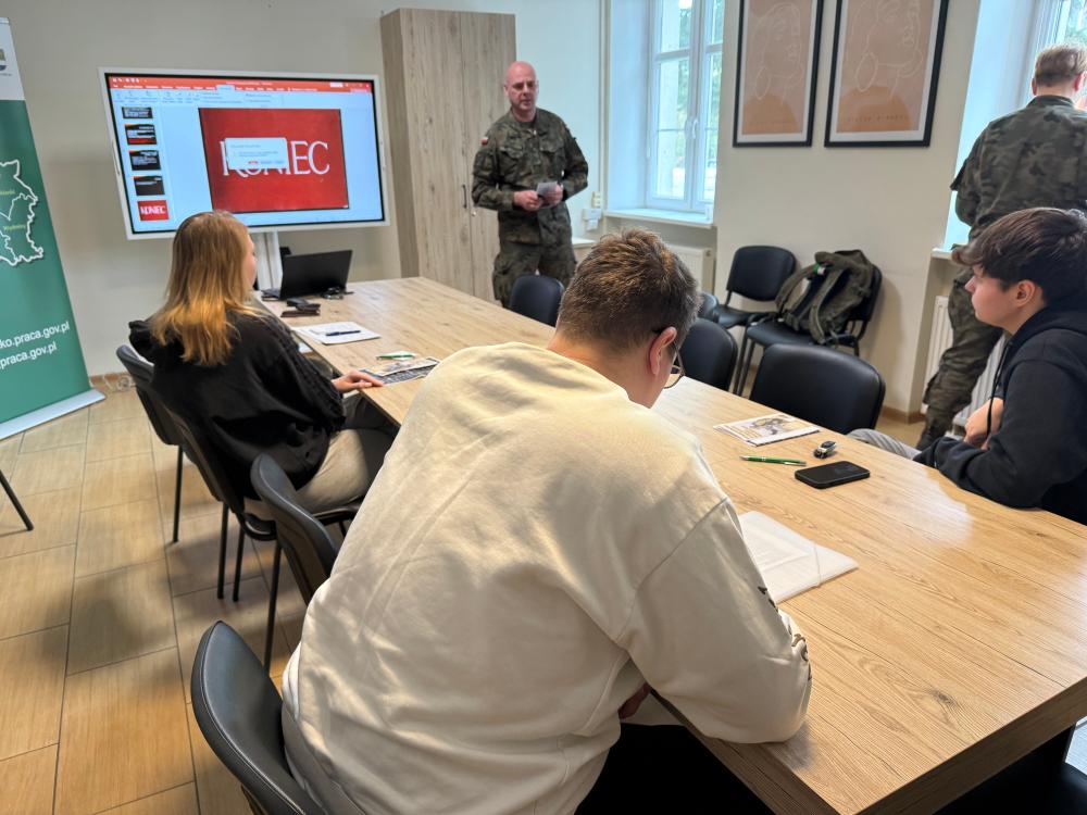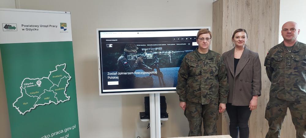 Osoby nowo zarejestrowane wzięły udział w spotkaniu dotyczącym możliwości korzystania z usług proponowanych przez urząd oraz zapoznały się z warunkami i możliwościami jakie daje zostanie żołnierzem. O służbie w ramach Wojsk Obrony Terytorialnej opowiedziała ppor. Małgorzata Wierzbicka – koordynator Mobilnych Zespołów Rekrutacyjnych z 41 Batalionu Obrony Pogranicza. Informacje nt zasadniczej służby wojskowej i możliwości jakie daje praca w wojsku przekazał mł. chor. Jarosław Skowron z Sekcji Promocji i Współpracy z WCR Giżycko.